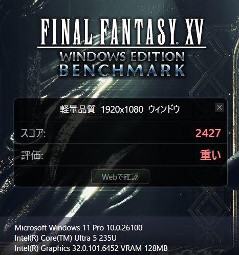 重い負荷のかかるFF15ベンチマークの結果は 「軽量品質」で「やや重い」、「標準品質」で「動作困難」。