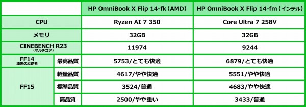 姉妹モデルのOmniBook X Flip 14-fm(インテル)のCore Ultra 7 258V搭載モデルとベンチマークのスコアを比較してみました。