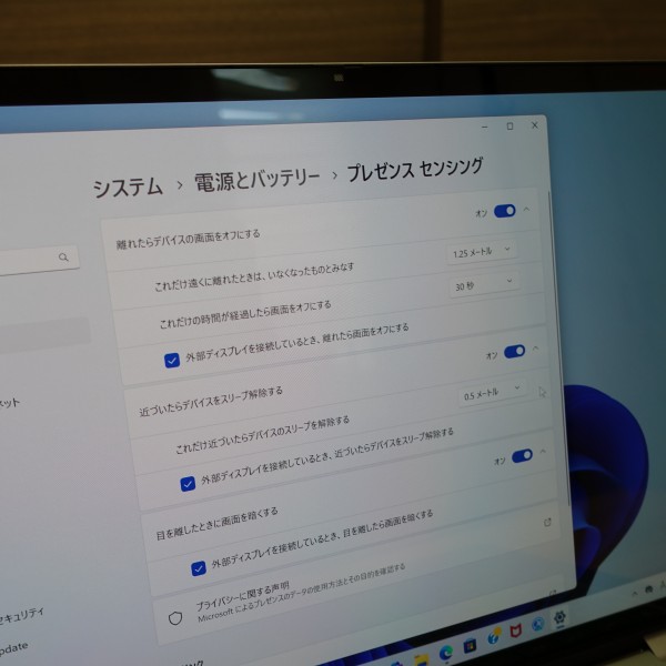 画面から目を離すと画面を暗くしたり、離席時に画面をオフにしたりすることができる プレゼンスセンシング機能も利用可能です。