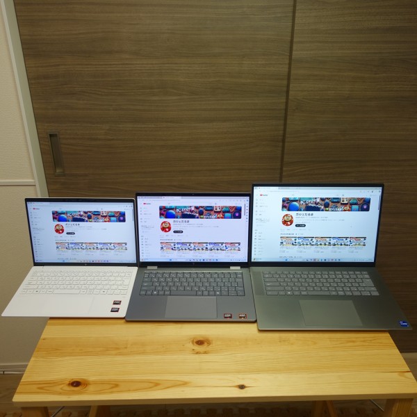 13.3インチ/16インチPCを並べてみました(左:13.3インチノート/真ん中:レビュー機(14インチ)/右:16インチノート)。