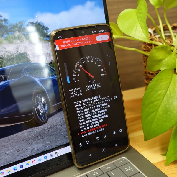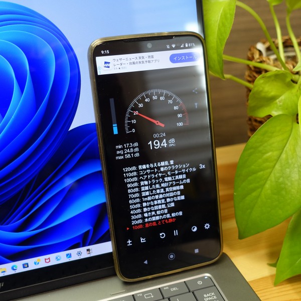 ファンの音をスマホの騒音計アプリで計測してみました。 ネットを見るなど一般的な使い方をしているときは19-22dB程度で静か。僕が使用する限り、ファンの音はほとんど聞こえてきませんでした。