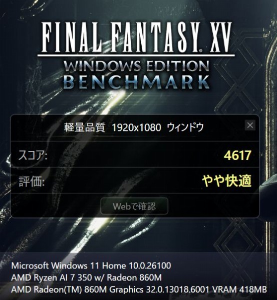 重い負荷のかかるFF15ベンチマークの結果は「軽量品質」で「やや快適」、「標準品質」は「普通」、「高品質」で「やや重い」。