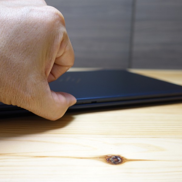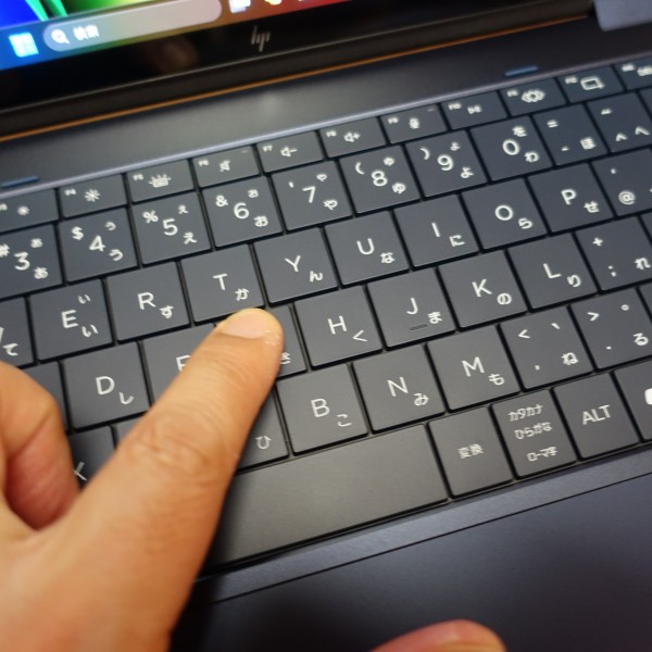 キーストローク(キーを押し込む深さ)は約1mm。一般的なスリムノートPCが約1.3mmなのでちょっと浅めです。 ただし、反発が強めのため、そんなに押し心地は悪くない印象。 ちょっとパコパコする感じがありますね。打鍵音はそれほど大きくはないです。 キートップはすべすべしていて指の滑りがいいですね。 キーを強く押すと少しボディがたわみますが、タイピング中、僕はあまり気にならなかったです。