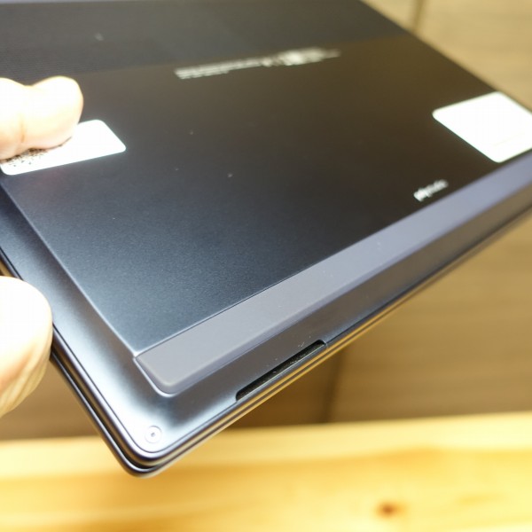 リフトアップヒンジではないので、キーボードに傾きが出ないタイプ。 平べったい感じなので、傾きがあるほうがタイピングしやすいですね。