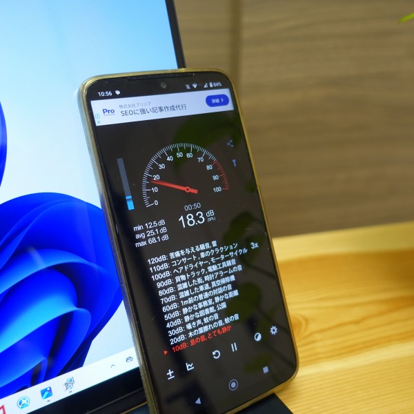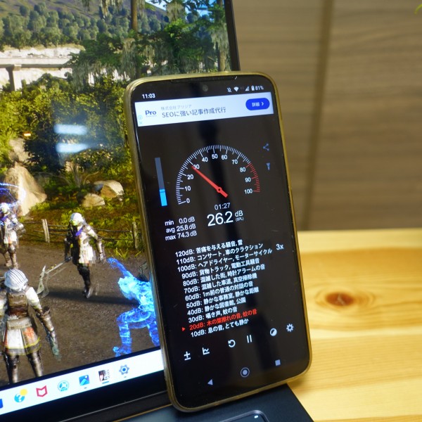 ファンの音をスマホの騒音計アプリで計測してみました。ネットを見るなど一般的な使い方をしているときは18-23dB程度で静か。 ファンの音はほとんど聞こえてきません。
