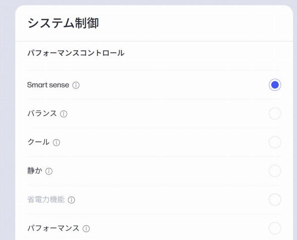 myHPアプリの「システム制御」に、「パフォーマンスのコントロール」機能が用意されており、6つの項目から、状況に応じた設定を選べます。今回は、状況に合わせて自動的に調整してくれる「SmartSense」で計測してみました。