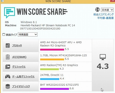 WINSCORE SHAREでWindowsエクスペリエンスインデックスの値をチェックして、Stream14のパフォーマンスがどのくらいなのかテストしてみました。結果は上の図のとおり。
