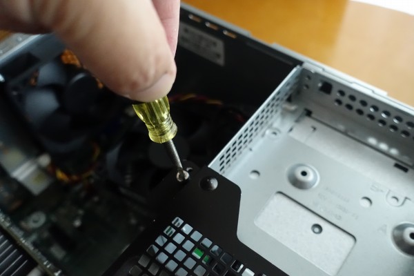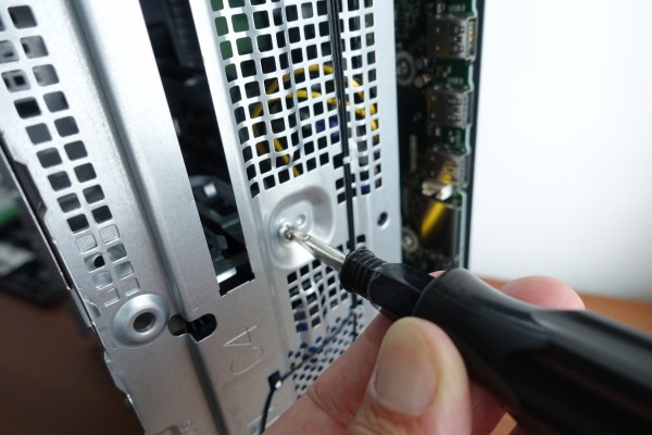 このドライブベイを取り外すには、前面部中央にあるネジを緩めます。