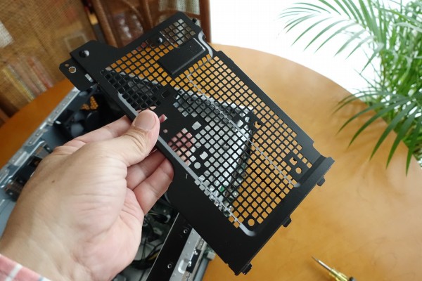 手前の右上に光学ドライブ、右下には鉄製の保護パーツが配置されています。
