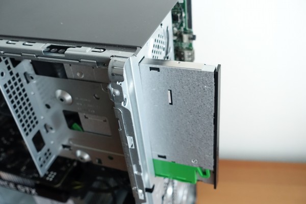 光学ドライブが縦向きに配置されているので、ケーブルを外した後、緑色のレバーを押しながら前面部方向に押すと、光学ドライブを取り外せます。