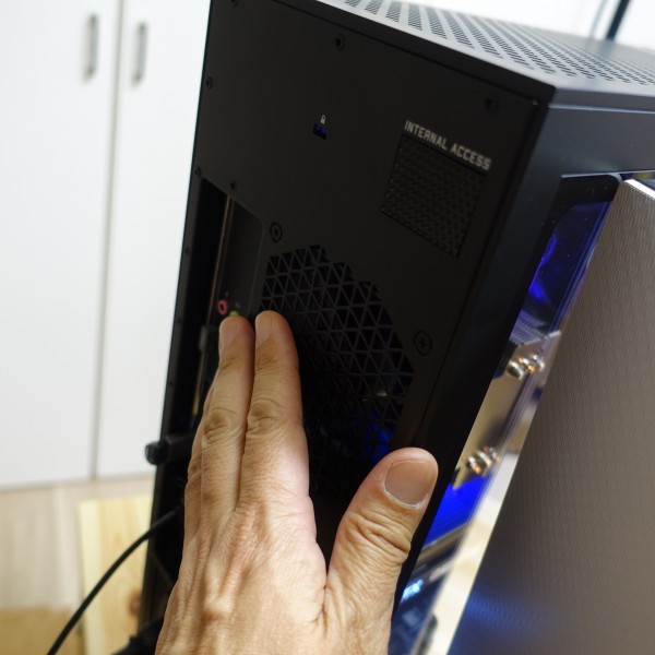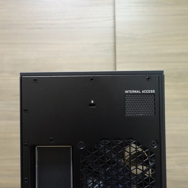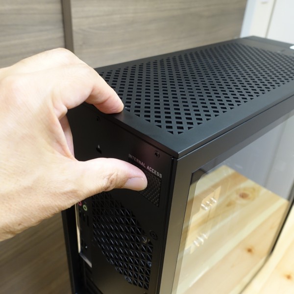 サイドパネルを取り外すには、背面部の右上にある「INTERNAL ACCESS」ボタンを押します。