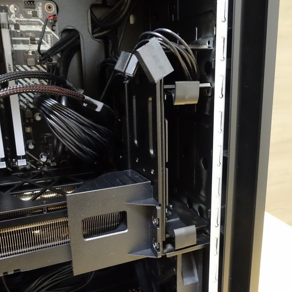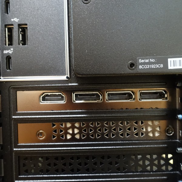 中段には、拡張カードを配置。この構成ではNVIDIA GeForce RTX4070グラフィックスが搭載されており、映像出力端子として、HDMI2.1 ×1、DisplayPort1.4a ×3が利用可能です。