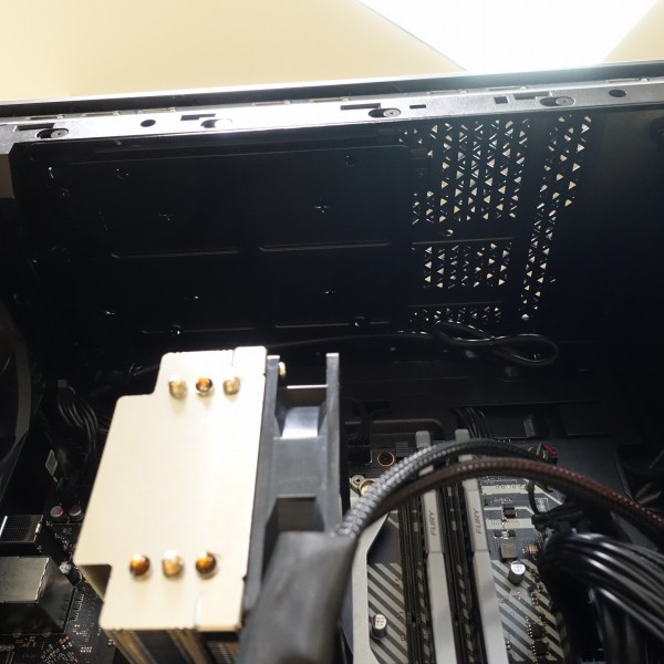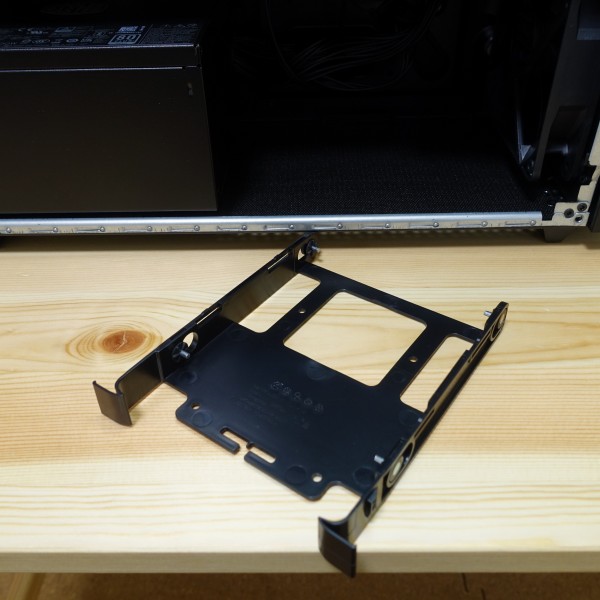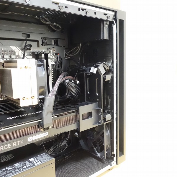 前面部の裏面に張り付く形で、2.5インチ/3.5インチ兼用ドライブベイが縦向きに配置されています。