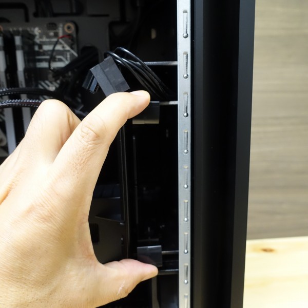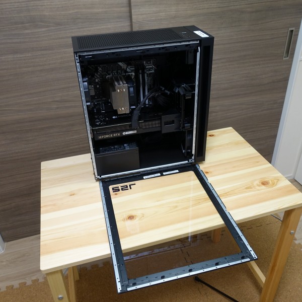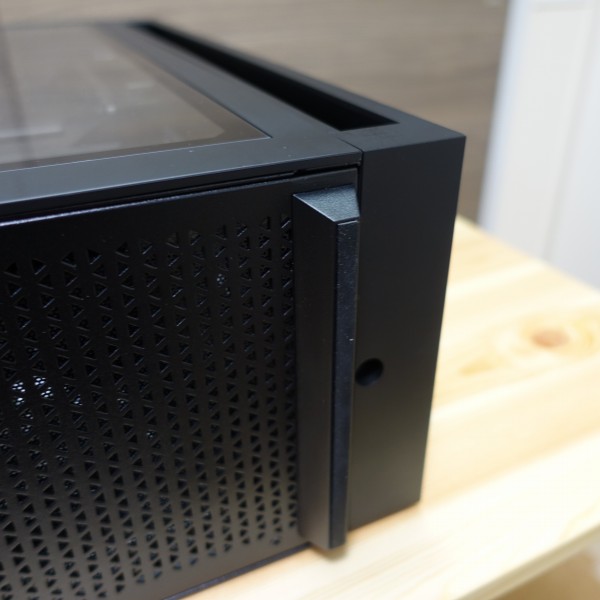 この状態で左側面部を手で軽く上に持ちあげると、サイドパネルを取り外すことができます。なお、装着も簡単。下部の留め具部にパネルを合わせて、はまればそのまま閉じるだけでOKです。これだけ簡単だと気軽にサイドパネルを取り外そうという気持になります。