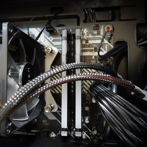 メモリスロットは4基搭載。レビュー機では、そのうちの2つのスロットを使用しています(8GB×2)。