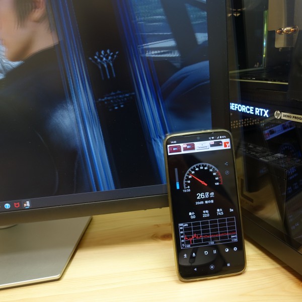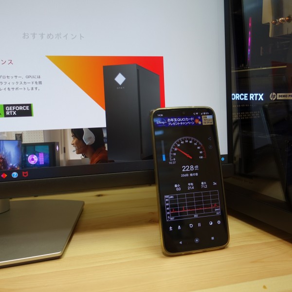 スマホの騒音計アプリで音を測定してみました。Webを見ているときなど負荷が軽めのタスクを実行しているときの音は20~25dB程度。アプリでは「蚊の音」から「囁き声」程度という評価(スマホのアプリなので正確ではない可能性があります)。ファンの回転数がそれほど上がらないため、風切り音が気になることはありませんでした。