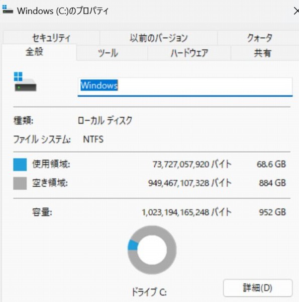 ちなみに使い始める前のストレージ容量は上のとおり。空き領域は884GB確保されています(個別の構成によって空き領域は異なる可能性があるので、あくまで参考程度にしてください)。