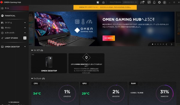 同梱されている「OMEN GAMING HUB」アプリケーションを使えば、多彩なカスタマイズ作業を行ったり、システム状況をチェックしたりできます。