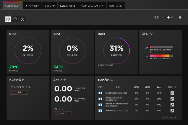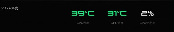 一番下には、「システム温度」が表示されます。CPU温度、GPU温度、CPU使用率が示され、現在マシンがどんな状態なのかを確認できます。