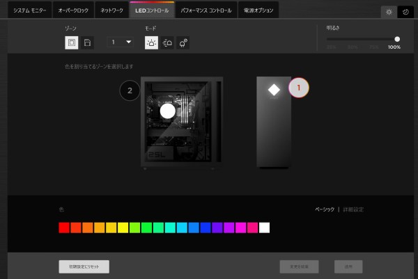 プリインストールされている「OMEN GAMING HUB」アプリケーションの「LEDコントロール」を使って、LEDのカラーリングを変更できる仕様になっています。カスタマイズできるのは、1)前面部上部のマーク部分、筐体内部の2)CPUファンと3)メモリの合計3箇所。モードとしては「常時点灯」「アニメーション」「オフ」の3つの中から選択できます。