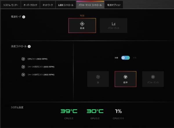 「パフォーマンスコントロール」ツールでは、電源モード/温度コントロール/システム温度の3つの項目が用意されています。