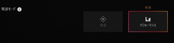 「電源モード」では、「最適」or「パフォーマンス」を選択可能。パフォーマンスを重視したい場合には「パフォーマンス」に設定できます。ただし、「パフォーマンス」を選択すると、ファンの回転数が上がり、風切り音が大きくなってうるさく感じる可能性が高くなります。