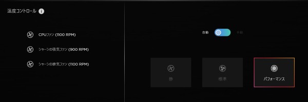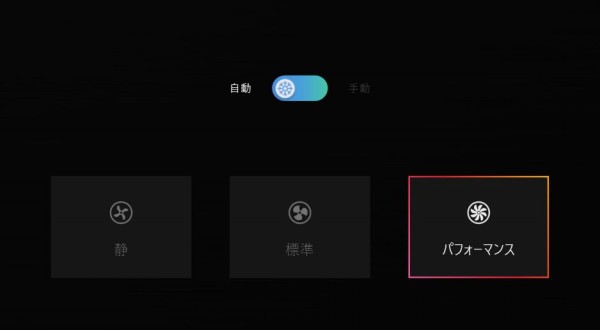 「自動」と「手動」を切り替えることができ、「自動」だと「静」「標準」「パフォーマンス」の3つのモードを選べます。