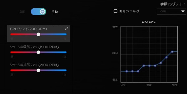 CPUファン、シャーシの吸気ファン、シャーシの排気ファンの回転数を手動で調整できます。