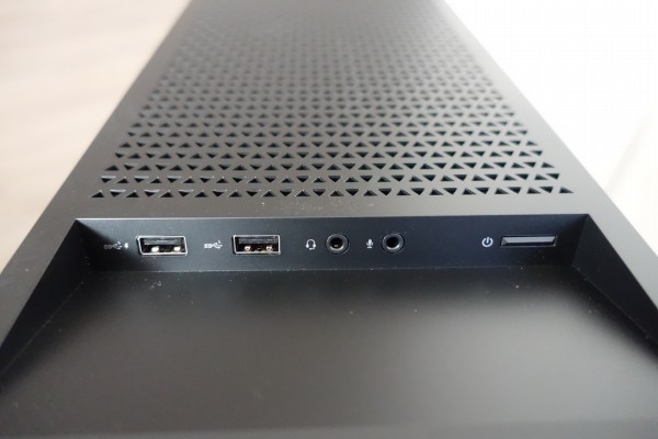 写真左から順に、SuperSpeed USB Type-A 5Gbps ×2(うち1ポートはバッテリチャージ機能対応)、ヘッドフォン出力/マイク入力コンボポート×1、マイク入力ポート×1、電源ボタンが配置されています。