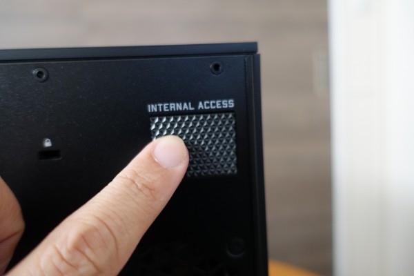 OMEN by HP 30L Desktopでは、背面部右上にあるボタンを軽く押すだけで簡単にサイドパネルのロックを解除できます。