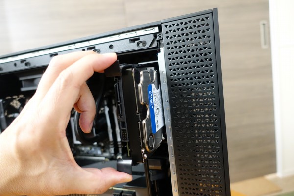 ケーブルを外した後、ツメを内側に押しながら引っ張り出せば、HDDを取り外せます。