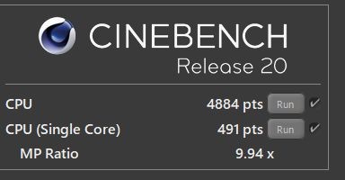 CPUの性能をチェックするCINEBENCHベンチマークのスコア。CPU:4884pts