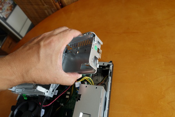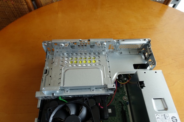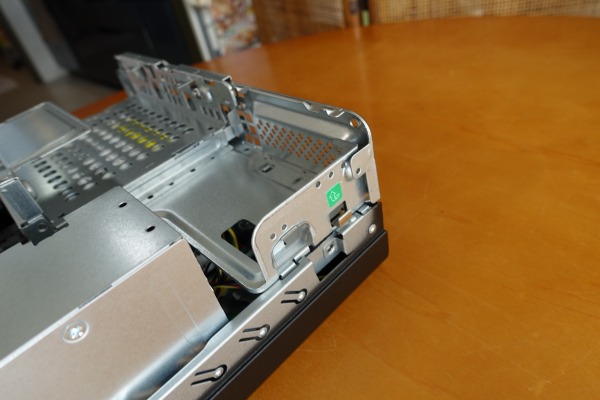 この構成では、上の部分は空きとなっており、下にスリムタイプ光学ドライブが重なるように配置されているのがわかります。空きの部分は、3.5/2.5インチベイとして使用できると思われます。
