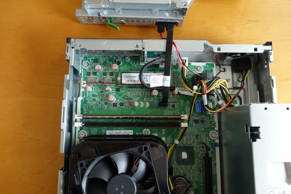 コンパクトタイプのボディを採用しているので、パーツが密接した状態で組み込まれています。メモリはこの光学ドライブの下に配置されており、そのままでは増設/取り外しができませんが、ProDesk 400 G6 SF/CTでは、この部分をを簡単に取り外せる使用になっています。