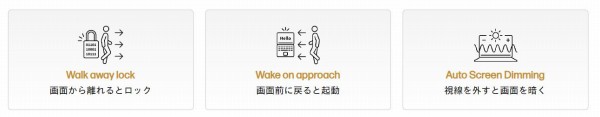 離れると画面をオフに、近づくとスリープ解除、視線を外すと画面を暗くする、といった機能が備えられています。