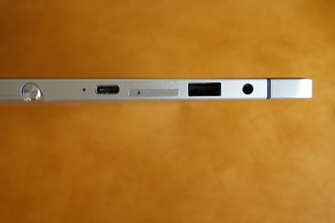 写真右から順に、マイク入力/ヘッドフォン出力コンボポート、USB3.0、micorSDカードスロット、USB-C(Thunderbolt、3.1)が配置されています。