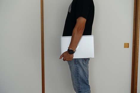 脇に抱えて持ってみました。このぐらいの大きさなら持ち運びしやすいですね。