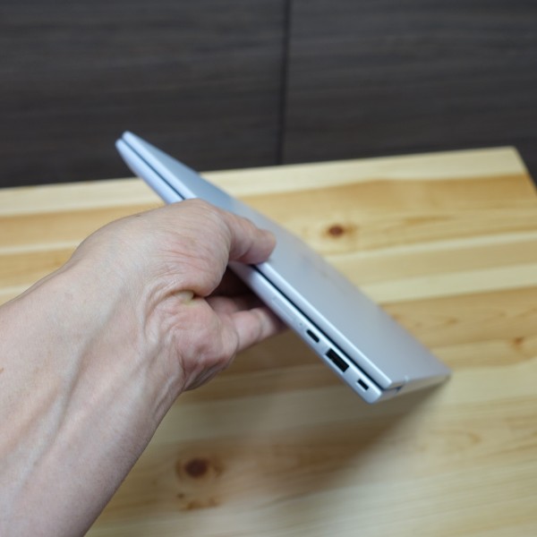 「すごく軽い」という感じはしませんが、14インチノートPCとしては軽めだと思います。このぐらいの重さなら外に持ち出そうという気になりますね。