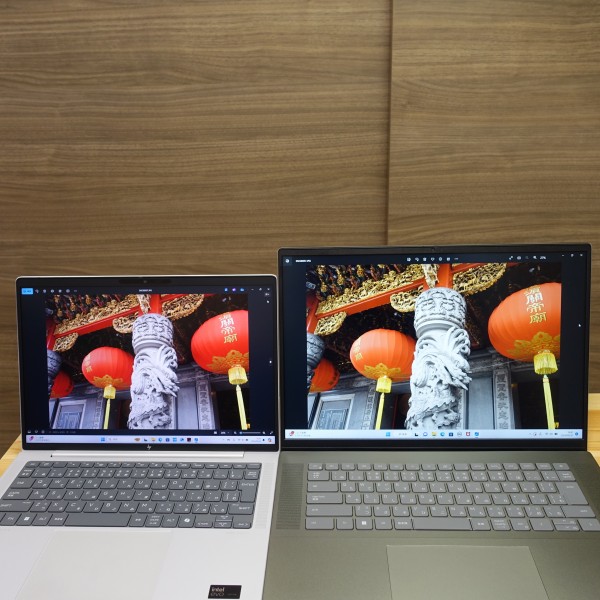 色域が狭いパネルを搭載したノートPCと比較すると、(上の画像の左がレビュー機、右が色域が狭いパネルを搭載した16インチノートPC)