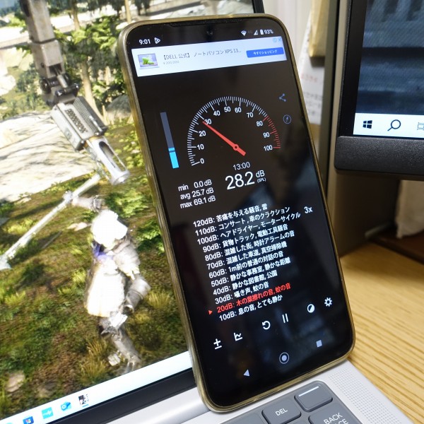 ファンの音をスマホの騒音計アプリで計測してみました(スマホのアプリなので数値が正確ではない可能性があります)。ネットを見るなど一般的な使い方をしているときは、15-20dB程度ですごく静か。ほとんどファンの音が聞こえてきません。