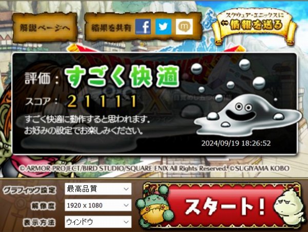 負荷が軽めのベンチマーク「ドラゴンクエストX」を実行したところ、「最高品質」で「快適」という結果です(レビュー機の構成:インテルCore Ultra 7 155H/32GBメモリ/512GB SSD/CPU内蔵グラフィックス)