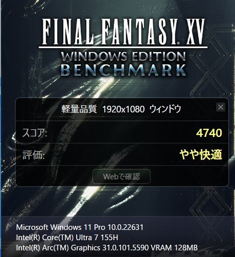 重い負荷のかかるFF15ベンチマークの結果は 「軽量品質」で「やや快適」、「標準品質」で「普通」、「高品質」で「やや重い」。