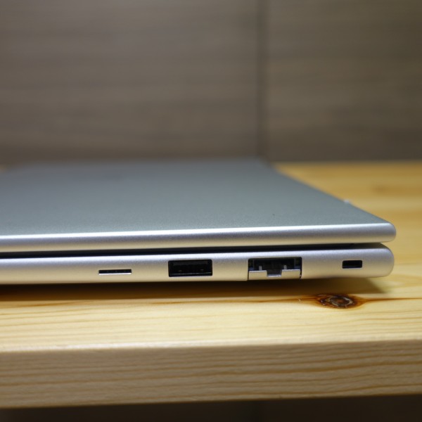 右側面部。USB Type-A、LAN端子が配置されています。レビュー機はLTE対応モデルなので、USB端子の左にnano SIMカードリーダーが配置されています。