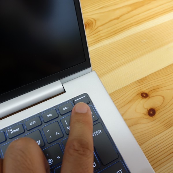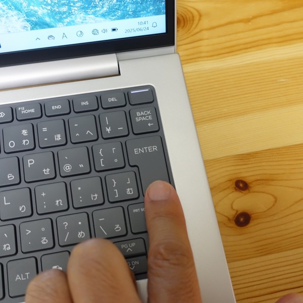 電源ボタンがキーボードの右上に配置されていますが、誤って押しても、軽く押すぐらいでは誤動作しませんでした。電源をオンにすると電源ボタンのライトが点灯します。