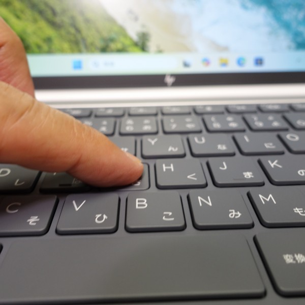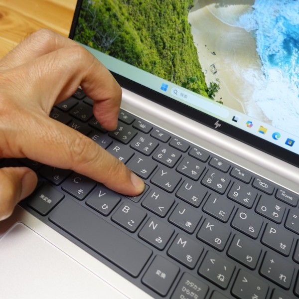 キーストローク(キーを押し込む深さ)は約1.5-1.7mm。スリムタイプPCとしては、結構しっかり押せます。反発が適度にあるので、きびきびタイピングできる印象。打鍵音はそれほど大きくなく、あまり気になりませんでした。