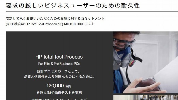 米国国防総省のMIL規格に準拠しているほか、HP独自のHP Total Test Processをパスしており、高い堅牢性を確保。