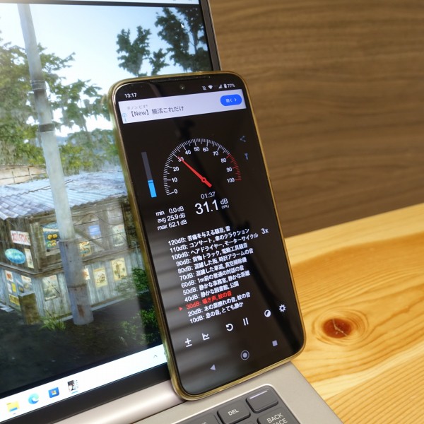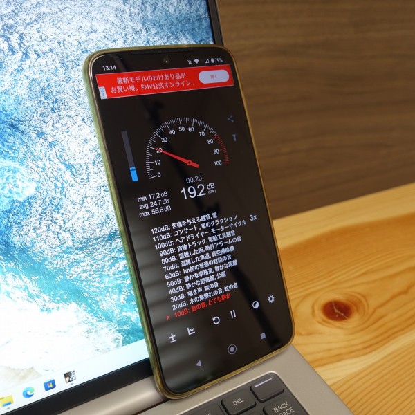 ファンの音をスマホの騒音計アプリで計測してみました。 ネットを見るなど一般的な使い方をしているとき、通常はファンの音が聞こえず、18-22dB程度で静か。