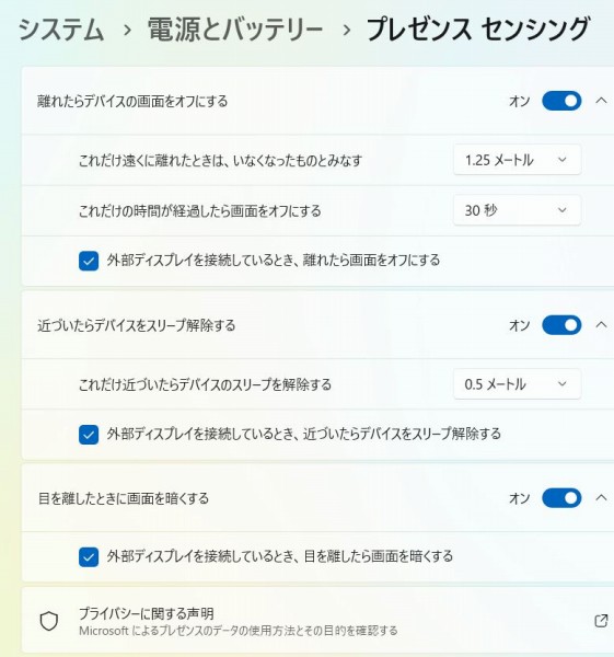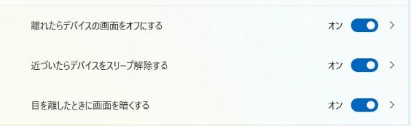 また席から離れたときに画面をオフにしたりできるプレゼンスセンシング機能も利用可能。オン/オフの切り替えが可能がほか、
