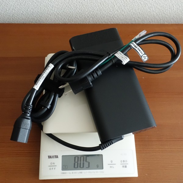 ACアダプタと電源ケーブルを合わせた重量は805g。結構重量があります。