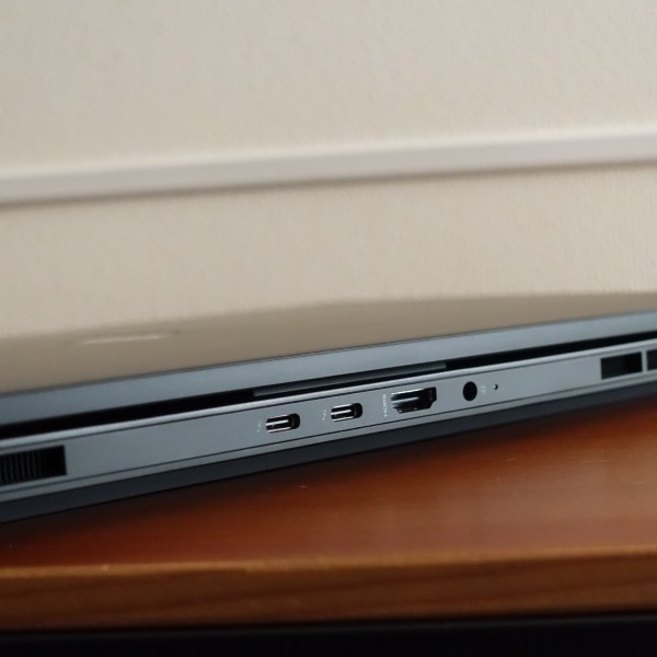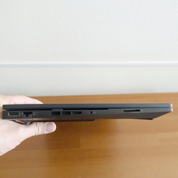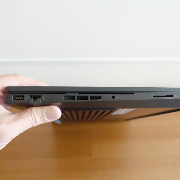 上の画像の左から順に、USB Type-A、LAN、ヘッドホン/マイクコンボ端子、SDカードスロットを配置。